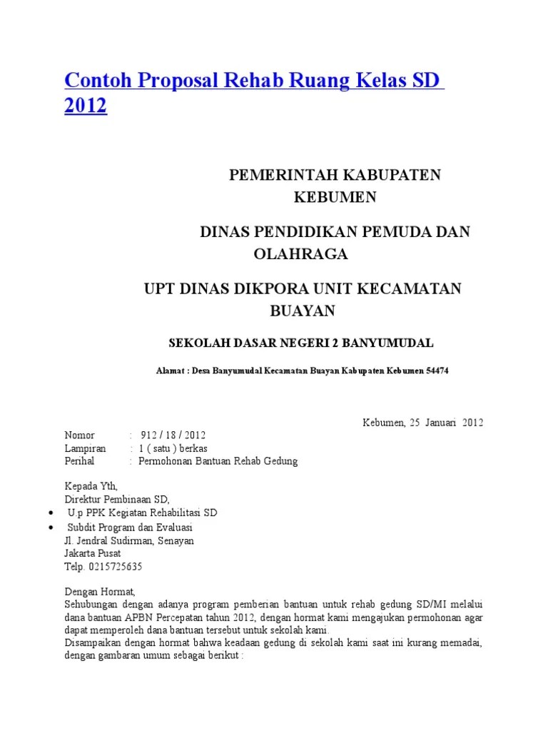 Tetapi bapak / ibu guru juga dapat mengubahnya . Contoh proposal yang akan guru abata bagikan adalah proposal renovasi ruang kelas atau rehab gedung sekolah. Contoh proposal bantuan dana rehab gedung sekolah. Permohonan bantuan dana rehabilitasi ruang kelas. Proposal rehab gedung sekolah sd tahun 2020 / 2021, contoh proposal rehap.